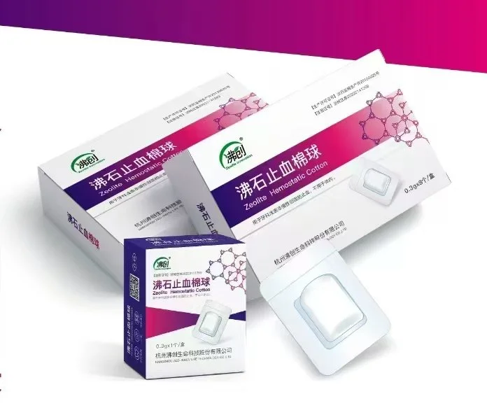 Boxes of zeolite hemostatic cotton with a small packet showing a white square gauze pad.
